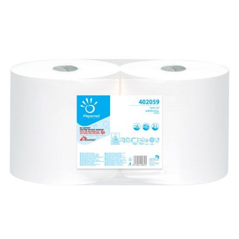 Rolă de hârtie industrială albă, cod 402059, 2 straturi, celuloză, 232 m, cu putere mare de absorbție și curățare, nu lasă scame, poate fi folosită atât în service-uri și spălătorii auto cât și în bucătării profesionale.