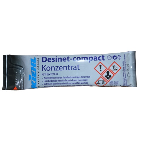 Desinet-compact concentrat este un detergent dezinfectant registrat conf. listei VAH şi IHO pentru dezinfectarea suprafeţelor. Acest produs nu conţine aldehide, fenoli, substanţe active metalo-organice. În timpul prelucrării Desinet-compact concentrat are un miros neutru, cu proprietăţi active de curăţare, şi se uscă fără urme de şters. Are acţiune contra bacteriilor grampositive şi gramnegative, ciupercilor, salmonelelor, listerinelor şi viruşilor capsulaţi (acţiune "virucidă limitată" incl. HIV, HBV, HCV). Pentru acest produs există un certificat de compatibilitate pentru domeniul alimentar.Compoziţie